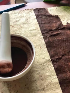 I paint on it with natural earth pigments, that is, rocks I find at the beach or in the mountains. I grind these rocks, add water and paint on the barkcloth. I also use Chinese ink and embroidery. I am currently exploring how to transform the barkcloth into the main material for making my puppets, from just making the clothes they wear to creating a whole character.